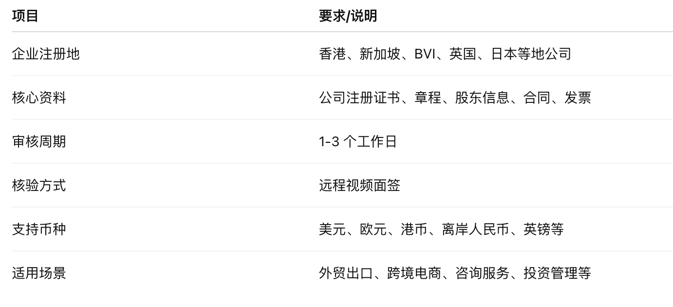 ⚠️ 注意: 如涉及虚拟货币或博彩行业,通常会被拒绝开户。