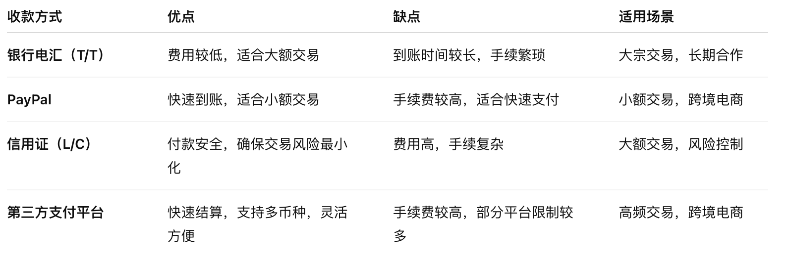 A:外贸公司常见的收款方式包括银行电汇(T/T)、PayPal、信用证(L/C)和第三方支付平台(如Payoneer)。